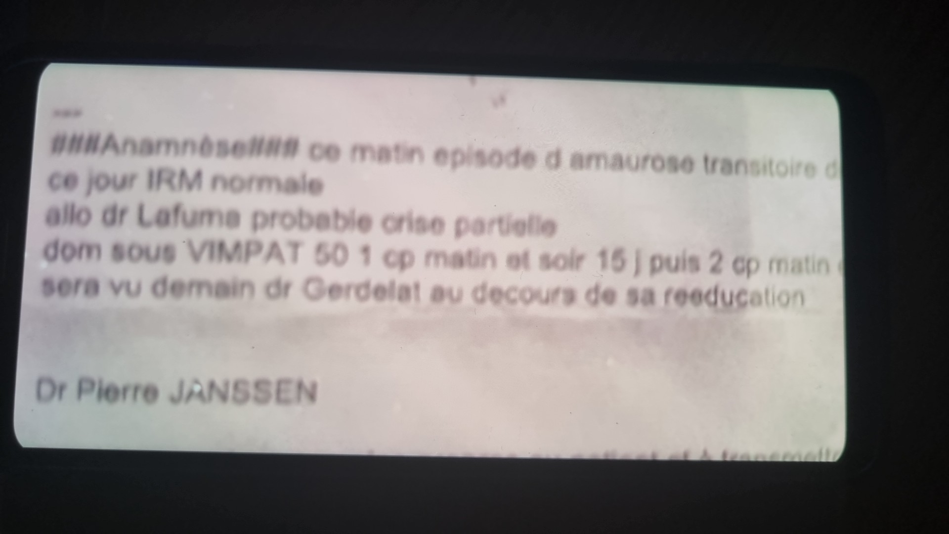 Complètement incompétent Suite irm au urgence des cedres le 21 novembre, le médecin urgentiste Jenssen appelle lafuma, c'est dans le compte rendu et elle analyse que probable crise épilepsie et avec Janssen ils font une ordonnance avec prise de médicaments vimpat 50 pour le soir même, Le lendemain la neurologue gerdelat des cedres me reçoit entre deux et me confirme un soupson épilepsie malgré mon affirmation d'une perte de vu et de forte douleurs a l'oeil, sauf que 3 jours après je suis au urgence neurologique à Purpan car j'ai fait un AVC, et je suis en neurologie vasculaire depuis 6 jours à Purpan... J'ai les documents compte rendu urgentiste dr Janssen ou il est noté quil contacte dr lafuma et prescrive une ordonnance vimpat 50 a prendre le soir meme et que dr gerdelat me recontacte le lendemain et dr gerdelat qui confirme soupson épilepsie , le 22 et 23 je suis en ssr chez Labarre et je signale à tout les soignant que j'ai la vue qui part régulièrement pendantles deux jours suivantsl'IRM et leur ordonnancecachet pourl'épilepsie, rien nest fait et les soignant sont au courant de la soit disante épilepsie, le 04 soit 15 jour plus tard le dr labarre fait un compte rendu médical ou elle soupçonne un ait, soit 10 jours après mon avc et leur soupson épilepsie du 21 ... Il y a plusieurs fautes et ils se couvrent avec des faux, mais la justice tranchera avec des témoignages et des fait datés, comme le compte rendu des urgences du 21 et la prescription du 21 faite par Janssen et Lafuma Je me réserve une ou plusieurs plainte sur plusieurs sujets