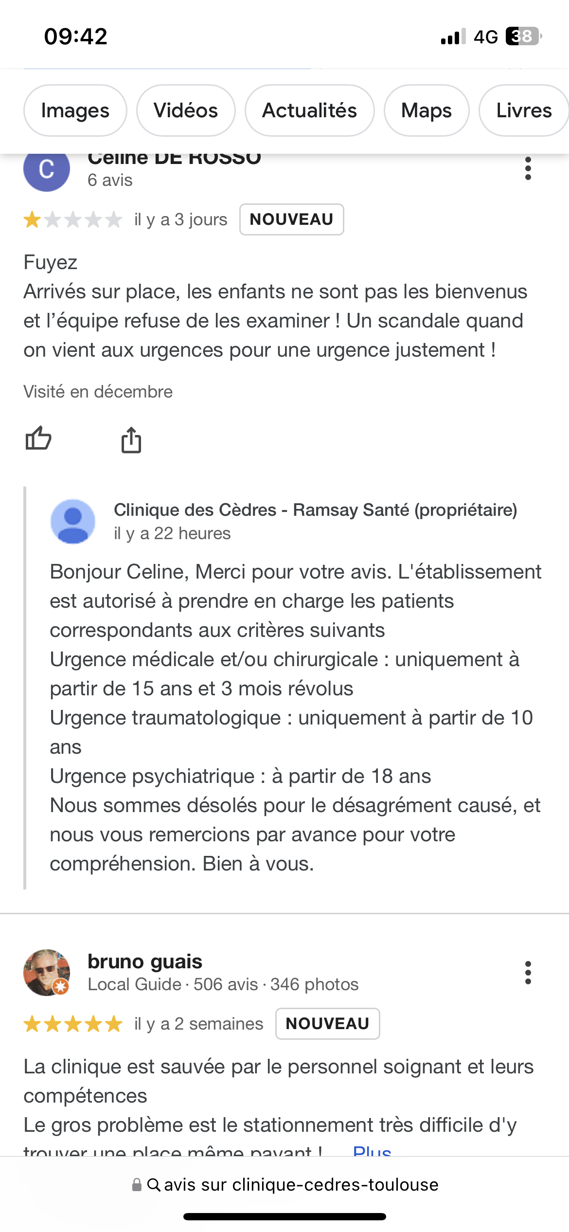 J'avais déjà pas un bon avis sur cette clinique mais pluS les années passent et plus le service laisse à désirer. Aucune considération pour la personne handicapée et son accompagnant. C'est un droit de se faire accompagner par ce dernier surtout quand on est sourde et qu'on ne parle pas le français. Bloquée aux urgences, personne nous tient au courant sur les résultats du scanner obtenus pourtant la veille et on fait bien de nouveau comprendre à l'accompagnant qui n'est autre qu'un membre de famille de 72 ans qui aura passé hier soir 4h dehors avec la canicule BRAVOOOOO LA CLINIQUE DES CEDRES qu'il n'est pas le bienvenu. On n'y est allé qu'en dernier recours donc j'espère que ses droits seront respectés autrement l'ARS sera ravie d'entendre que les personnes handicapées ne sont pas considérées dans votre clinique. Pas la peine de me balancer votre message type sous mon commentaire.