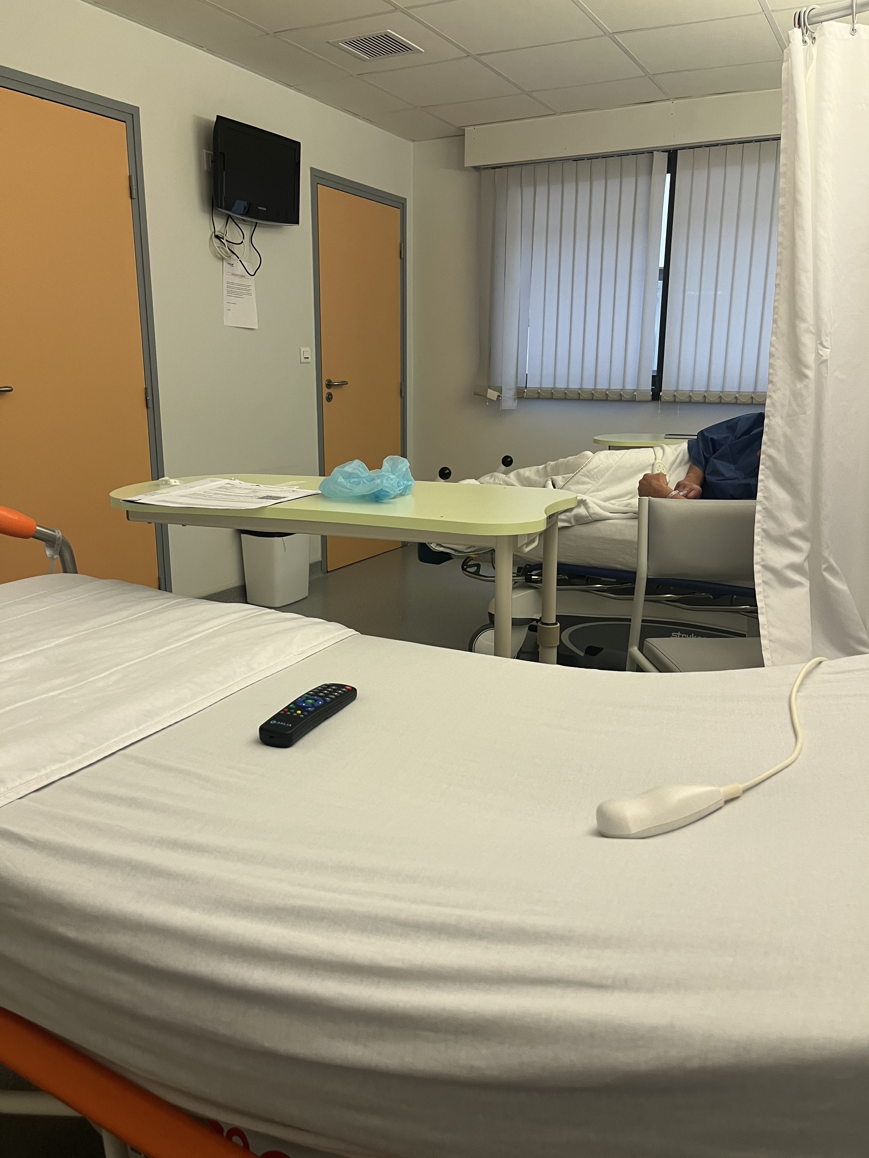 Arrivé à 10h40 à l'accueil la très bien.apres attendre plus d'1 heure ,dans la chambre pas avant midi . Prise en charge par l'infirmière très bien. Chambre à 102 euros !!! Rien de plus pas de nettoyage de la chambre télécommande pleine de crasse. Retour dans la chambre après opération à 18h45 et personne avant 22h45 !!! Et quand tu sonne arrivé 1h après.merci le privé. Si non chirurgie très bien et personnel très gentil. Mais pas disponible. À boire à 23h45 rien à manger. J1 12 h j2 10h30.et total 225 euros hôtel de luxe